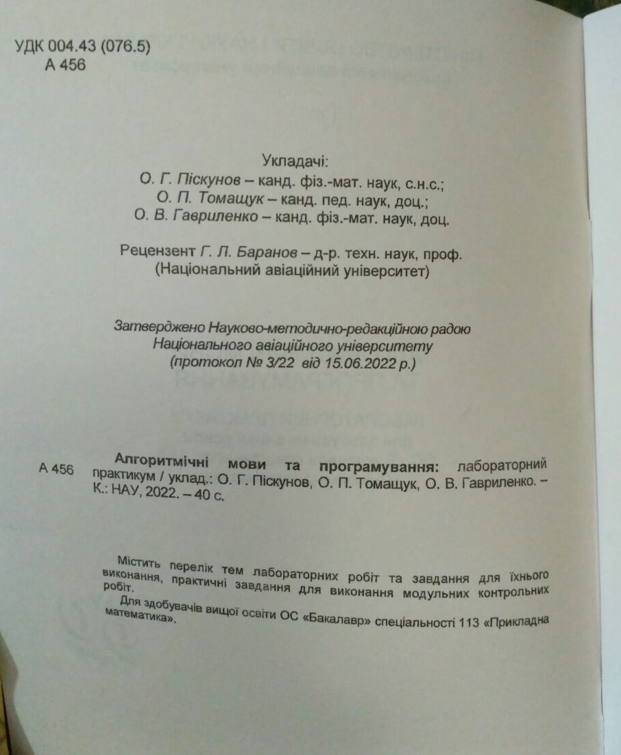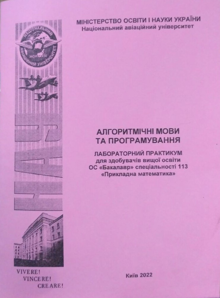 У важкий для нас всіх час кафедра прикладної математики факультету кібербезпеки, комп’ютерної та програмної інженерії НАУ продовжує активно працювати, удосконалюватися та займатися педагогічною діяльністю. Зокрема працівники кафедри с.н.с. О. Г. Піскунов, доц. О. П. Томащук підготували новий посібник «Алгоритмічні мови та програмування: лабораторний практикум».